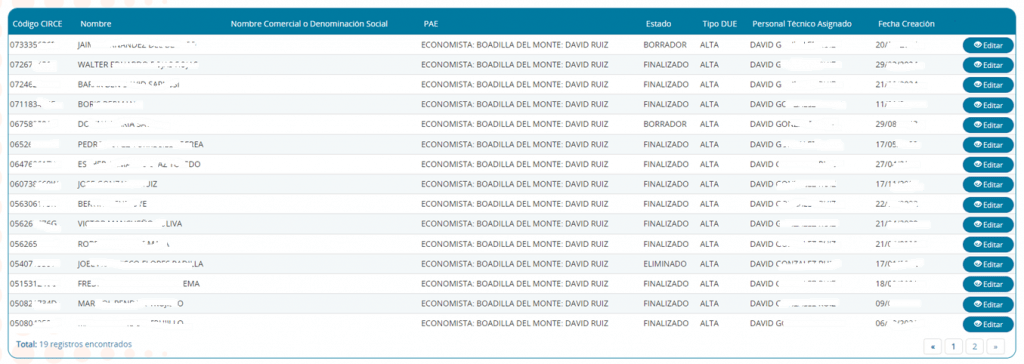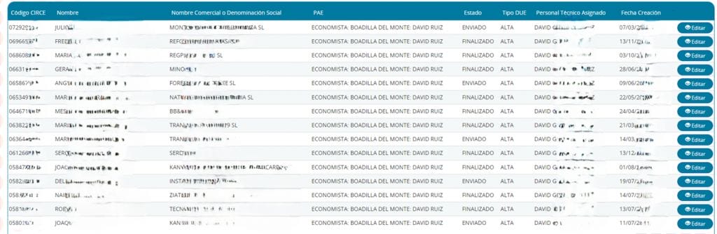 En esta pantalla puedes ver una muestra de los últimos expedientes que hemos tramitado, de personas que han confiado en nosotros para crear sus empresas.